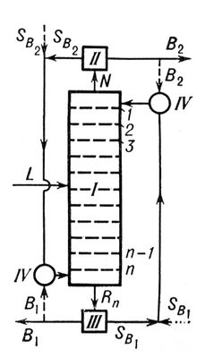 Рис. 2. Схема установки непрерывного действия для экстракции двумя растворителями: 1 - колонна; II - установка для регенерации экстрагента SB2, III- установка для регенерации экстрагента SB1, IV- дополнительные смесители (в случае работы с флегмой); 1,2,3, ..., n-1, n-номера ступеней: L - исходный раствор; N - сырой экстракт; Rn - сырой рафинат; B1, B2 - экстрагируемые компоненты.