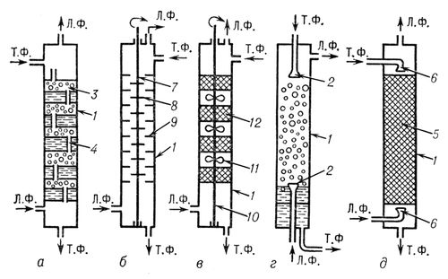Рис. 3. Схемы экстракционных колонн: а — колонна с ситчатыми тарелками; б — роторно-дисковый экстрактор; в — колонна с чередующимися смесительными и отстойными насадочными секциями; г — распылительная колонна; д — насадочная колонна; 1 — колонна; 2, 6 — распылители; 3 — ситчатая тарелка; 4 — переливные трубки; 5, 12 — насадки; 7, 10 — валы; 8 — плоский ротор; 9 — кольцевые перегородки; 11 — мешалки;