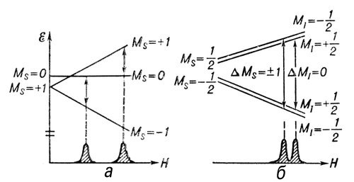 Рис. 3. а — тонкая структура спектра ЭПР. Для случая S = 1 наблюдаются две линии поглощения в результате расщепления уровней при Н = 0; б — сверхтонкая структура спектра ЭПР.