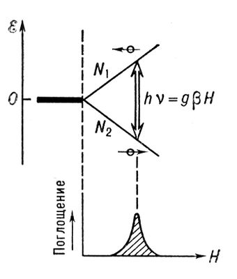 Если магнитный момент парамагнитной частицы обусловлен только спином электрона S = 1/2, то m = gsbMs, где gs = 2,0023 — фактор спектроскопического расщепления для свободного электрона, b — магнетон Бора, a Ms — магнитное квантовое число, принимающее значения ± 1/2. Во внешнем статическом магнитном поле Н эти электроны парамагнитных частиц разбиваются на 2 группы с энергиями — gsbH/2 и + gsbH/2. Между этими группами уровней возможны квантовые переходы, которые возбуждаются полем H1^H. Условие резонанса записывается в виде: