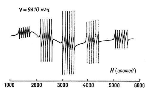 Рис. 4. Спектр ЭПР иона Mn2+ в кристалле метасиликата. Видны 5 групп линий тонкой структуры, соответствующих спину иона Mn2+ S = 5/2. Каждая группа состоит из 6 линий сверхтонкой структуры, обусловленной взаимодействием с ядерным спином I = 5/2.