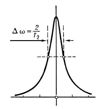 Резонансная линия имеет ширину Dw = 2/T2 (рис. 2). В сильных полях H1 наступает «насыщение» — увеличение ширины и уменьшение амплитуды линии при ½g½H1 > (T1T2)-1/2. Насыщение сопровождается уменьшением ядерной намагниченности. Этому соответствует выравнивание населённостей уровней в результате переходов, вызванных полем H1. Ширина линий в кристаллах определяется магнитным полем соседних ядер. Для многих кристаллов спин-спиновое взаимодействие ядер настолько велико, что приводит к расщеплению резонансной линии.