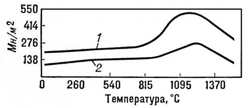 Рис. 1. Зависимость предела прочности бериллида ниобия от температуры при: 1 — изгибе; 2 — растяжении.