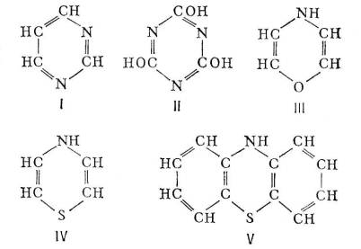 Азины, гетероциклические соединения, содержащие в цикле, наряду с атомами углерода, не менее двух других атомов, из которых, по крайней мере, один — атом азота. Азины с двумя атомами азота в кольце называют диазинами, например пиримидин (1), с тремя — триазинами, например циануровая кислота (II), и т. д. К числу азинов, в цикл которых входят, кроме азота, другие атомы, относятся, например, оксазин (III), тиазин (IV). Азины обладают основным характером и дают соли с кислотами.