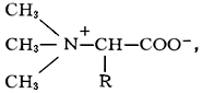 кристаллические вещества. Бетаины — внутренние соли триалкилзамещённых аминокислот. Молекула бетаина содержит положительно заряженный четвертичный атом азота и отрицательно заряженную карбоксильную группу, представляя собой, т. о., биполярный ион. Бетаины хорошо растворимы в воде. С рядом кислот и с хлоридами тяжёлых металлов бетаины образуют нерастворимые соединения (например, золото-, платино-, свинцовохлористоводородные соли). Эту реакцию используют для их выделения. Бетаины распространены в животном и растительном мире. Их получают действием алкилгалогенидов или алкилсульфатов на аминокислоты и др. способами.