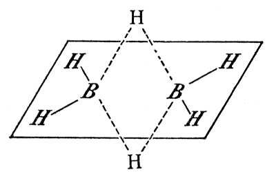 Бороводороды, гидриды бора, бораны, соединения бора с водородом. Известны бороводороды, содержащие от 2 до 20 атомов бора в молекуле. Простейший бороводород, BH3, в свободном состоянии не существует, он известен лишь в виде комплексов с аминами, эфирами и т.п. Характер связей в бороводородах очень своеобразен, они являются электрондефицитными соединениями, т. е. не имеют достаточного числа электронов для связывания всех атомов обычными двухэлектронными валентными связями. В диборане B2H6 (рис.) каждый атом бора связан с двумя атомами водорода обычными связями; между собой атомы бора связаны трёхцентровыми «мостиковыми» связями, возникающими в результате обобществления пары электронов тремя атомами — двумя В и одним H (показаны пунктиром). Структура других бороводородов ещё сложнее. Бороводороды, в отличие от углеводородов, образуют не цепочки атомов, а сложные пространственные структуры. Низшие бороводороды — газы (B2H6 и B4H10 — тетраборан) и жидкости (B5H9 — пентаборан), высшие (B10H14 — декаборан и др.) — твёрдые вещества. Бороводороды бесцветны, имеют неприятный запах и очень ядовиты. Низшие бороводороды легко окисляются, самовоспламеняясь на воздухе при невысоких температурах (ниже 100°С), и легко разлагаются водой с выделением водорода и образованием борной кислоты. Высшие бороводороды более устойчивы и менее реакционноспособны. Все бороводороды при температуре выше 700 °С разлагаются на бор и водород.