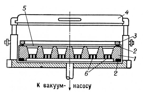 Простейшая вакуумформовочная установка: 1 — форма-матрица; 2 — прокладки; 3 — прижимная рама; 4 — электронагреватель; 5 — лист термопласта; 6 — отверстия в матрице.