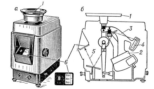 Рис. 6. Квадрантные весы с проекционной шкалой (а — общий вид, б — схема): 1 — грузоприёмная чашка; 2 — противовес-квадрант; 3 — рычаг, угол отклонения которого измеряется с помощью проекционной шкалы 4, через которую проходит световой пучок 5, проектирующий изображение шкалы на экран 6.