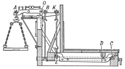 Рис. 2. Схема десятичных весов системы Квинтенца. АОК — рычаг 1-го рода, EDC — рычаг 2-го рода. Гири уравновешивают в 10 раз большую нагрузку при следующих условиях: ОА : ОВ = 10 : 1; CE : CD = OK : OB.