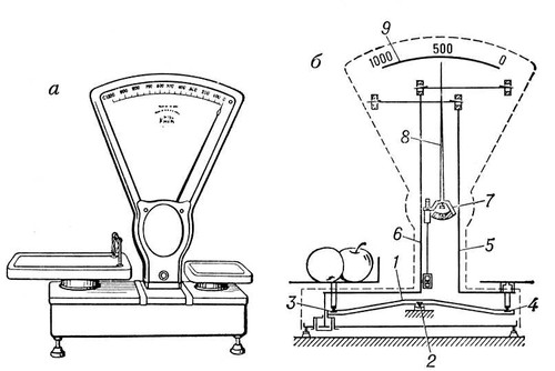 Рис. 7. Настольные циферблатные (торговые) весы (а — общий вид, б — схема): 1 — основной равноплечный рычаг; 2 — опорная призма; 3—4 — грузоприемные призмы; 5—6 — стойки для предотвращения опрокидывания чашек; 7 — квадрант; 8 — стрелка; 9 — шкала.