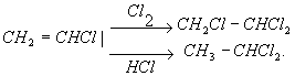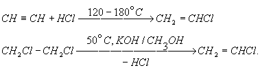 Винилхлорид полимеризуется и сополимеризуется с винилиденхлоридом, винилацетатом и др. В промышленности винилхлорид получают парофазным (реже жидкофазным) гидрохлорированием ацетилена в присутствии HgCl2 на угле или дегидрохлорированием дихлорэтана: