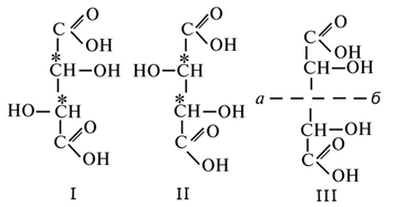 с двумя асимметричными атомами углерода в молекуле. Известны все теоретически возможные винные кислоты: D-винная (виннокаменная) кислота (I), растворы которой вращают плоскость поляризованного света вправо; её оптический антипод (см. Антиподы оптические) — L-винная кислота (II); D, L-винная (виноградная) кислота (рацемическое соединение D- и L-винных кислот, см. Изомерия) и мезовинная (антивинная) кислота (III), оптически недеятельная, что объясняется внутримолекулярной компенсацией вращения плоскости поляризации, обусловленной наличием дополнительной оси симметрии (аб).