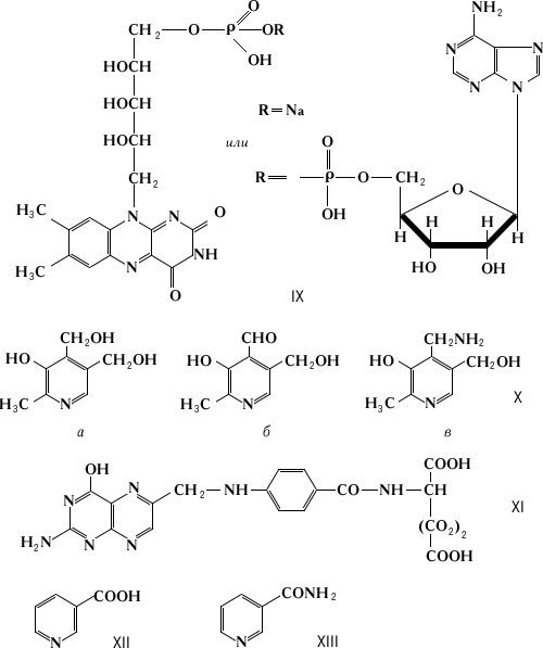 Витамин В2 (рибофлавин, VIII) образуется при культивировании Eremothecium ashbyii и других микроорганизмов без выделения в виде сухой биомассы (с использованием только для кормления с.-х. животных), а синтетический рибофлавин (применяемый в медицине) получают в виде кристаллического продукта деструктивным окислением D-глюкозы (из кукурузного крахмала) в D-apaбоновую кислоту и рядом других операций превращают в конечный продукт — жёлто-оранжевые кристаллы высокой степени чистоты. Важное производное рибофлавина — его кофермент рибофлавин-5'-фосфат натрия (IX, R = Na), применяемый для инъекций, получают фосфорилированием рибофлавина, а другой кофермент — ФАД (IX, R — остаток аденозин-5'-фосфата) получают конденсацией рибофлавина-фосфата и аденозин-5'-фосфата.