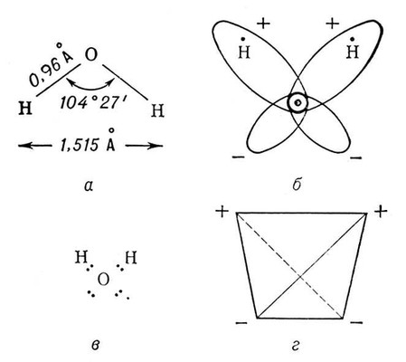 Рис. 1. Структура молекулы воды: а — геометрия молекулы H2O (в парообразном состоянии); б — электронные орбиты в молекуле H2O; в — электронная формула молекулы H2O (видны необобществленные электронные пары); г — четыре полюса зарядов в молекуле H2O расположены в вершинах тетраэдра.