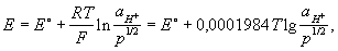 Между водородом, адсорбированным платиновой чернью, и ионами водорода в растворе устанавливается равновесие. Потенциал электрода Е определяется уравнением Нернста:
