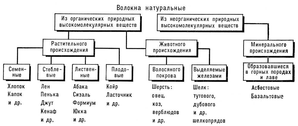 Волокна текстильные натуральные, протяжённые гибкие и прочные тела с очень малыми поперечными размерами, ограниченной длиной, пригодные для изготовления пряжи и текстильных изделий. Волокна текстильные, не делящиеся в продольном направлении, называются элементарными, а состоящие из нескольких элементарных, скрепленных продольно, — техническими (комплексными). Элементарные волокна текстильные значительной длины называются элементарными нитями. Почти все волокна текстильные состоят из высокомолекулярных веществ. Характерная особенность строения волокон текстильных — наличие продольных структурных элементов — фибрилл, слоёв. Некоторые волокна текстильные имеют каналы, бывают извиты или скручены. Классификация основных видов волокон текстильных приведена на рис.