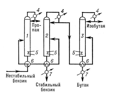 Схема газофракционирующей установки: 1 — пропановая колонна; 2 — стабилизационная колонна; 3 — изобутановая колонна; 4 — конденсаторы-холодильники; 5 — подогреватели низа колонны; 6 — теплообменники; 7— холодильники.