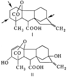 Гиббереллины, ростовые вещества растений. Известно 27 гиббереллинов; все они принадлежат к тетрациклическим дитерпеноидам и являются карбоновыми кислотами. Основной структурной единицей гиббереллинов считается гиббереллин ГК9 (I); остальные гиббереллины рассматриваются как его производные. Гиббереллины неустойчивы и быстро разрушаются в кислой или щелочной среде. Наибольшей биологической активностью чаще обладает гибберелловая кислота (ГК3), отличающаяся от ГК9 наличием гидроксилов у углеродов (отмечены стрелками) и двойной связью (II): молярная масса 346.39, tпл 233—235 °C.