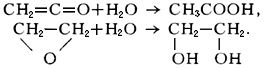 В результате гидратации кетена образуется уксусная кислота, а окиси этилена — этиленгликоль: