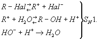 В зависимости от строения углеводородного радикала (R) и от условий реакции гидролиза галогенпроизводных может осуществляться как мономолекулярный (SN1) или бимолекулярный (SN2) процесс. В случае мономолекулярной реакции вначале происходит ионизация связи углерод — галоген, а затем образующийся ион карбония реагирует с водой; щёлочь, если она добавлена, не влияет на скорость гидролиза и служит только для нейтрализации выделяющейся галогеноводородной кислоты и смещения равновесия:
