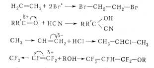 В соединениях с двумя двойными связями, разделёнными одной простой связью, имеет место сопряжение p-связей и образование единого p-электронного облака, лабильность которого проявляется вдоль всей цепи (рис. 2, слева). Следствием такого сопряжения является способность к реакциям 1,4-присоединения: