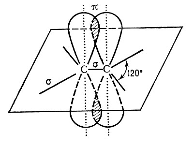 Двойная связь, ковалентная четырёхэлектронная связь между двумя соседними атомами в молекуле. Двойная связь обычно обозначается двумя валентными штрихами: >С=С<, >C=N —, >С=О, >C=S, — N=N —, — Н=О и др. При этом подразумевается, что одна пара электронов с sp2 или sp - гибридизованными орбиталями образует s-связь (см. рис. 1), электронная плотность которой сосредоточена вдоль межатомной оси; s-связь подобна простой связи. Другая пара электронов с р-орбиталями образует p-связь, электронная плотность которой сосредоточена вне межатомной оси. Если в образовании двойной связи принимают участие атомы IV или V группы периодической системы, то эти атомы и атомы, связанные с ними непосредственно, расположены в одной плоскости; валентные углы равны 120°. В случае несимметричных систем возможны искажения молекулярной структуры. Двойная связь короче простой связи и характеризуется высоким энергетическим барьером внутреннего вращения; поэтому положения заместителей при атомах, связанных двойной связью, неэквивалентны, и это обусловливает явление геометрической изомерии. Соединения, содержащие двойную связь, способны к реакциям присоединения. Если двойная связь электронно-симметрична, то реакции осуществляются как по радикальному (путем гомолиза p-связи), так и по ионному механизмам (вследствие поляризующего действия среды). Если электроотрицательности атомов, связанных двойной связью, различны или если с ними связаны различные заместители, то p-связь сильно поляризована. Соединения, содержащие полярную двойную связь, склонны к присоединению по ионному механизму: к электроноакцепторной двойной связи легко присоединяются нуклеофильные реагенты, а к электронодонорной двойной связи — электрофильные. Направление смещения электронов при поляризации двойной связи принято указывать стрелками в формулах, а образующиеся избыточные заряды — символами d- и d+. Это облегчает понимание радикального и ионного механизмов реакций присоединения: