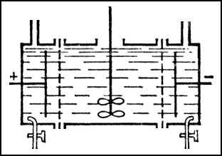 Диализ в электрическом поле — электродиализ — в десятки раз ускоряет очистку диализуемых систем от электролитов. Простой электродиализатор (рис.) состоит из трёх камер, отделённых одна от другой мембранами. В среднюю камеру заливают очищаемую жидкость, в боковых проточных камерах расположены электроды, погруженные в растворитель. Ионы в постоянном электрическом поле направленно перемещаются к соответствующим электродам, проникая при этом сквозь мембраны из средней камеры в боковые. Особенно эффективен электродиализ с применением ионитовых мембран, изготовленных из ионообменных материалов (см. Ионообменные смолы). Мембраны в зависимости от знака электрического заряда на их поверхности пропускают преимущественно или катионы, или анионы. Многокамерные электродиализаторы с ионитовыми мембранами применяют в гидрометаллургии и атомной промышленности (для очистки сбросных вод, концентрирования растворов солей, разделения близких по свойствам элементов), при обессоливании морской воды.