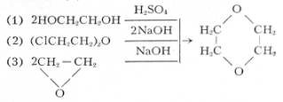 Диоксан, диэтилендиоксид, циклический простой эфир; бесцветная подвижная жидкость с эфирным запахом; tпл 11,8°С, tkип 101,3°C, плотность 1,03375 г/см3; показатель преломления n20D 1,42241; tвсп 5°С (в закрытой чашке); пределы взрываемости в воздухе 1,97—22,5% (по объёму). Диоксан смешивается с водой, спиртом, эфиром; образует с водой азеотропную смесь (tkип 87,8°С, 81,6% диоксана). В промышленности диоксан получают из этиленгликоля (1), из хлорекса (2) и из окиси этилена (3):