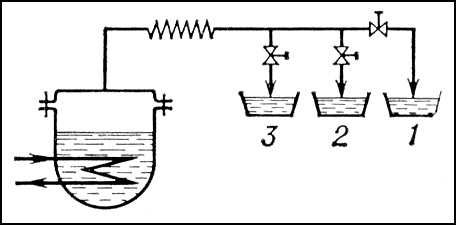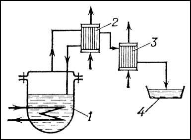 Фракционная дистилляция, называемая также дробной перегонкой (рис. 2), — одна из разновидностей простой дистилляции. Такую дистилляцию применяют для разделения смеси жидкостей на фракции, кипящие в узких интервалах температур. При этом дистилляты разных составов отводят (последовательно во времени) в несколько сборников. В сборник 1 поступает первая по времени порция дистиллята, наиболее богатая низкокипящими компонентами, в сборник 2 — менее богатая, в сборник 3 — ещё менее богатая и т.д. В каждом из этих дистиллятов (фракциях) преобладает один или несколько компонентов исходной смеси с близкими температурами кипения. Простую дистилляцию для улучшения разделения смесей часто комбинируют с противоточной дефлегмацией (рис. 3). При этом образующиеся в кубе 1 пары частично конденсируются в дефлегматоре 2, конденсат (флегма) непрерывно возвращается в куб, а остаток паров после дефлегматора поступает в конденсатор 3, откуда дистиллят стекает в сборник 4. Этим способом достигается большее обогащение дистиллята низкокипящими компонентами, т.к. при частичной конденсации (дефлегмации) паров преимущественно конденсируются высококипящие компоненты.