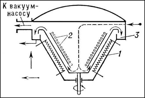 Для уменьшения времени диффузии молекул летучего компонента из глубины слоя жидкости к поверхности испарения процесс в современных молекулярных кубах проводят в очень тонких плёнках жидкости, что позволяет, кроме того, уменьшить время нахождения вещества на поверхности испарения и опасность его термического разложения. Для молекулярной дистилляции применяют аппараты с горизонтальными и вертикальными поверхностями испарения, а также получившие наибольшее промышленное применение центробежные аппараты. В последних процесс характеризуется наименьшими толщиной жидкой плёнки (в среднем 0,05 мм) и временем её пребывания на поверхности нагрева (0,03—1,2 сек). В центробежных аппаратах (рис. 5) на испаритель 1, представляющий собой быстровращающийся конус (иногда диск), подаётся разделяемая смесь. Центробежная сила перемещает жидкость от центра к периферии (вверх). Пары перегоняемого вещества собираются на неподвижном конденсаторе 2, расположенном параллельно поверхности испарителя, откуда дистиллят непрерывно отводится. Остаток после перегонки сбрасывается в кольцевой жёлоб 3 и выводится из куба. Для увеличения эффекта разделения устанавливают несколько аппаратов последовательно.