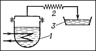 Простая дистилляция (рис. 1) проводится частичным испарением кипящей жидкой смеси, непрерывным отводом и последующей конденсацией образовавшихся паров. Так как пары над кипящей жидкой смесью содержат низкокипящих компонентов больше, чем жидкость, то конденсат (называемый дистиллятом) обогащается, а неиспарившаяся жидкость (кубовый остаток) обедняется ими. В дистилляционном кубе 1 кипит исходная жидкая смесь. Образующиеся пары непрерывно отводятся в конденсатор 2, где образуется дистиллят, который стекает в приёмник 3. При простой дистилляции содержание низкокипящих компонентов в паровой и жидкой фазах непрерывно падает. Поэтому состав дистиллята меняется во времени. Простая дистилляция, осуществляемая по описанной схеме, — периодический процесс. Для ускорения процесса применяют полунепрерывную дистилляцию, при которой в дистилляционный куб непрерывно поступает исходная смесь, равная массе уходящих паров.