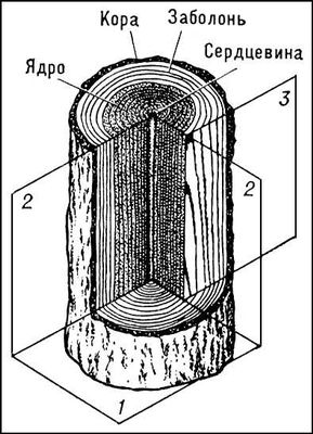Физиологические и анатомические особенности древесины. Форма и величина клеток, слагающих древесину, различны и зависят от их функций. Древесина содержит проводящие, механические и запасающие элементы. Строение древесины типично для родов, а иногда и для видов древесных растений. При изучении древесины и её свойств пользуются 3 главными разрезами, а для микроскопического изучения — срезами: поперечным, тангенциальным (тангентальным) и радиальным (рис. 1). По мере роста деревьев внутренняя, наиболее старая древесина ствола отмирает. Проводящие элементы древесины постепенно закупориваются: сосуды — так называемыми тиллами, трахеиды — торусами их окаймлённых пор. Проводящая и запасающая системы перестают функционировать, содержание в древесине воды, крахмала, отчасти жиров уменьшается, количество смол, дубильных веществ повышается. У ядровых пород (сосна, лиственница, дуб) центральная часть древесины отличается по окраске и называется ядром, периферическая зона называется заболонью. У спелодревесных пород (ель, липа) периферическая часть отличается от центральной меньшей влажностью (такая древесина называется спелой). У заболонных пород (клён, берёза) центральная часть ничем не отличается от периферической. Иногда у заболонных и спелодревесных пород центральная часть ствола окрашивается темнее (главным образом под влиянием грибов) и образуется так называемое ложное ядро.