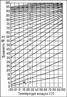 где W — влажность в %, m— начальная масса образца, m0 — масса образца в абсолютно сухом состоянии. Пределом гигроскопичности (точкой насыщения волокна) называется состояние, при котором в древесине содержится максимальное количество связанной (гигроскопической) влаги, а свободная влага отсутствует. Влажность, соответствующая пределу гигроскопичности Wпг при t 20°С, составляет в среднем 30%. На большинство свойств древесины оказывает влияние изменение содержания связанной влаги. При достаточно длительной выдержке древесина приобретает равновесную влажность Wp, которая зависит от влажности j и температуры t окружающего воздуха (рис. 5). Уменьшение содержания связанной влаги вызывает сокращение линейных размеров и объёма древесины — усушку. Усушка