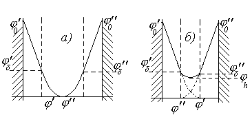 Рис. 2.21. Схема изменения потенциала в зазоре между частицами: a– до перекрытия, б – после перекрытия
