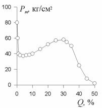 При адсорбции на поверхности микродефекта молекул воды или других дипольных молекул возникают дополнительные силы отталкивания электростатической природы. На рис. 2.44 показана зависимость прочности структуры при взаимодействии спрессованных в таблетки частиц гидроксида магния от содержания воды, являющейся для этих систем ПАВ. Введение небольшого количества (до 1% массы твердой фазы) воды приводит к нарушению непосредственных контактов между частицами и формированию коагуляционных контактов через водную прослойку. Переход от монослоя воды к полимолекулярным слоям с искривленной поверхностью вызывает появление капиллярного давления. Это давление, зависящее от радиуса кривизны поверхности и краевого угла смачивания Q (для гидрофильных поверхностей Q < 90o), может при тонких прослойках жидкости между частицами усиливать их взаимное притяжение. Последующее увеличение количества жидкой фазы вплоть до такого содержания, когда среднее расстояние между частицами будет больше, чем расстояние, соответствующее положению потенциальной ямы, приведет к переходу от объемной структуры (см. рис. 2.36, а) к линейным агрегатам частиц (см. рис. 2.36, в) и соответствующему понижению прочности структуры в дисперсной системе. В соответствии с этим кривая зависимости прочности структуры от содержания дисперсионной среды проходит через минимум (монослой жидкости) и через максимум (коагуляционная структура с фиксацией частиц во втором потенциальном минимуме).