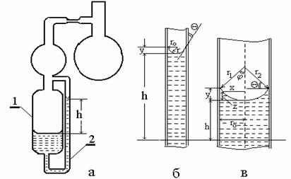Наиболее простой случай проявления капиллярности возможен при образовании мениска в капилляре круглого сечения с небольшим радиусом в приборе для определения поверхностного натяжения, схема которого приведена на рис. 1.6,а. В этом случае оба радиуса кривизны равны радиусу капилляра и уравнение Лапласа (1.1.37) записывают в виде
