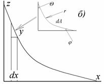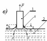 Отклонение формы мениска от сферической можно учитывать с помощью уравнения Рэлея, справедливого при r< Рис. 1.6. Схема прибора для определения поверхностного натяжения методом капиллярного поднятия (a), мениск жидкости в узком (б) и в широком (в) капиллярах Первый член разложения соответствует простому уравнению (1.1.41), второй - учитывает массу жидкости в мениске, форма которого предполагается сферической, а третий - отклонение формы мениска от сферической. Хаган и Дизайненс при решении задачи для эллиптического мениска пришли к аналогичному уравнению: Для узких трубок поправки, рассчитанные по уравнениям (1.1.42), (1.1.43) и (1.1.44), соответственно составляют 1,005; 1,006617 и 1,006623, что коррелирует с погрешностью определения h порядка 10-6м. Решение задачи введения поправок на отклонение от сферичности для широких капилляров привело Рэлея к выводу, что для воды необходима трубка с диаметром 5 см, чтобы исключить капиллярное поднятие. Для капилляров промежуточного размера используют поправки Бешфорта и Адамса. Если рассматривать фигуру вращения, приведенную на рис. 1.6, в, в точке пересечения мениска с его осью, т.е. при капиллярном поднятии на его дне, то оба радиуса кривизны должны быть равны (r1=r2). Обозначим в точке z r1=r2=b. Тогда При z=0 DP=2s/b, а при любом другом значении z изменение давления DP=Dgz. Бешфорт и Адамс для расчета поправок предложили использовать уравнения в безразмерной форме: где j - угол, дополняющий угол смачивания до 90o. Числовые решения уравнения (1.1.46) были проведены Бешфортом и Адамсом и приведены в виде таблиц для различных b и j. Эти таблицы позволяют внести поправки при расчете поверхностного натяжения по экспериментально измеренным радиусам капилляров, плотности жидкостей и воздуха, высоте подъема жидкостей по капиллярам и уточнить значения радиуса кривизны мениска и поверхности натяжения. Рис.1.7. Схема прибора для определения поверхностного натяжения методом Вильгельми (а), схема цилиндрического мениска у вертикальной пластинки (б), пластинка, подвешенная в жидкости (в).