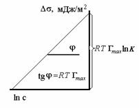 , как это показано на рис. 1.16, по углу наклона можно определить предел адсорбции, а по отрезку, отсекаемому наклонной линией на оси ординат при ln c = 0, рассчитать постоянную равновесия процесса адсорбции K.