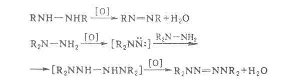 RH + N2 + + Н2О; окисление сим- и несим-диалкилгидразинов приводит соотв. к азоалканам и тетразенам (через промежуточные аминонитрены):