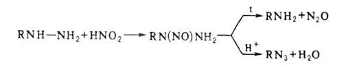 Действием HNO2 на алкил- или арилгидразины получают их нитрозопроизводные, к-рые м. б. превращены в амины или азиды: