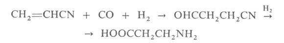 Гидроформилирование используют в пром-сти для получения альдегидов, из к-рых синтезируют гл. обр. спирты и карбоновые к-ты. Так, из этилена получают пропионовую к-ту, из пропилена-бутанол, из олефинов, содержащих в молекуле 6-20 атомов С (они образуются при крекинге парафинов), - спирты, используемые для синтеза ПАВ. Разработаны также способы гидроформилирования акрилонитрила с послед. получением из образующегося альдегида
