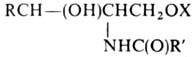 ГЛИКОСФИНГОЛИПИДЫ, липиды общей ф-лы , где R и R'-алкил или алкенил (могут содержать гидроксигруппу) с 13-24 атомами С; Х-остаток углевода. В зависимости от структуры X делятся на нейтральные (моно- и олигогликозилцерамиды), к-рые содержат в молекуле нейтральные сахара и N-ацетиламиносахара, и кислые (ганглиозиды и сульфогликозилцерамиды), содержащие в углеводном остатке карбоксильные группы или остаток серной к-ты.