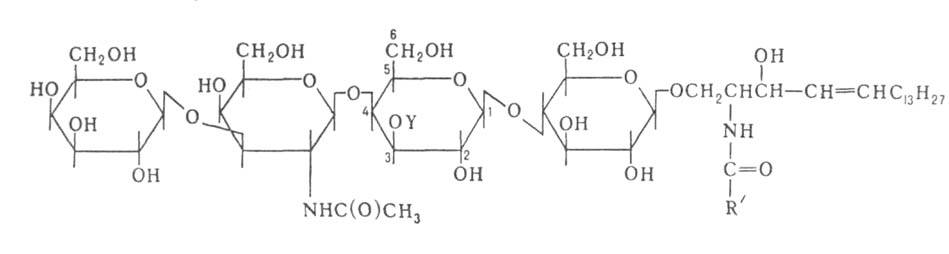 Название гликосфинголипидов по правилам ИЮПАК определяется углеводной частью молекулы. Так, соед. ф-лы I (Y = Н, в общей ф-ле Х-остаток ганглиотетраозы) наз. ганглиотетраозилцерамидом и обозначается GgOse4Cer, где GgOse-олигосахаридная цепь, Сег-остаток церамида (в общей ф-ле X = Н); цифра в ниж. индексе показывает кол-во остатков моносахаридов в олигосахаридной цепи.