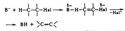 По этому механизму идет, напр., дегидрогалогенирования вторичных и третичных алкилгалогенидов в слабоосновных, но хорошо сольватирующих р-рителях (напр., в спиртах, воде, карбоновых к-тах). Механизм бимолекулярной р-ции можно записать в след. виде: