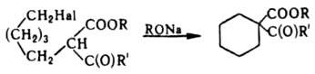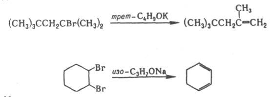 Дегидрогалогенирование винилгалогенидов и 1,2-дигалогенидов проводят либо при нагр. с щелочами или амидами щелочных металлов, либо под действием гидроксида тетрабутиламмония, генерируемого в межфазных условиях, напр., в системе пентан - водный р-р NaOH в присут. бисульфата тетрабутиламмония. Дегидрогалогенирование с образованием циклов имеет меньшее значение. Оно используется, напр., для синтеза циклоалканов:
