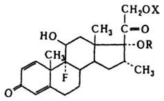 392,47, бесцв. кристаллы; т. пл. 253°С (с разл.); [a]D20 80° (1%-ный р-р в диоксане); не раств. в воде, раств. в этаноле и СНСl3. Получают дексаметазон многостадийным синтезом из диосгенина и соласодина, выделяемых из растений семейств Dioscorea и Solanum соотв. Дексаметазон - кортикостероид противовоспалит. и антиаллергич. действия, в 25 раз активнее гидрокортизона. Применяется при коллагенозах (ревматич. артрит, красная волчанка и т.п.), бронхиальной астме, воспалит. и аллергич. заболеваниях глаз и т.д. Синтезированы эфиры дексаметазона, к-рые по фармакологич. действию аналогичны дексаметазону. Динатрийфосфат дексаметазона [в ф-ле R = Н, X = P(O)(ONa)2] - т. наз. растворимая форма дексаметазона - бесцв. кристаллы; раств. в воде. Гигроскопичен. Применяется при острой адренокортикоидной недостаточности, шоке, тяжелых аллергич. р-циях и т. п., а также в виде глазных капель при офтальмогерпесе, дистрофиях роговицы и др. 17-Валерат дексаметазона (в ф-ле X = Н, R = СОС4Н9) - бесцв. кристаллы; т. пл. 181-183 °С; не раств. в воде, хорошо раств. в ацетоне, СНСl3 и этаноле. Этот эфир активнее дексаметазона при местном применении (в виде мазей). Г. С. Гриненко.