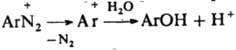 При взаимод. катиона диазония (I) с ОН- образуется цис-диазогидроксид (II) - амфотерное соед., диссоциирующее с образованием циc-диазотата (III). Константа кислотности I ниже, чем II, поэтому равновесная концентрация последнее мала. Равновесие между I и III устанавливается за несколько мс. Щелочная соль цис-диазотата в твердом виде крайне неустойчива. В щелочном р-ре при нагр. циc-диазотат превращается в транс-форму (IV), щелочные соли к-рой стабильны; они бесцветны или окрашены в желтый цвет Обратному переходу IV в III способствует УФ облучение. При подкислении бифункциональный анион IV превращается в транс-диазогидроксид (V) или N-нитрозамин (VI), к-рые далее переходят в катион I. Из транс-диазотата (IV) катион диазония I образуется относительно медленно, т.к. они не находятся в состоянии простого протолитич. равновесия. Наличие в нейтральных и слабокислых средах N-нитрозамина способствует частичному дедиазотированию и образованию амина ArNH2. Если X = SO23- или CN-, то образуются ковалентные цис- и транс-диазосульфонаты Аr—N=N—SO3Na либо диазоцианиды Ar—N=N—CN. Однако эти транс-изомеры, в отличие от транс-диазогидроксида (V), в темновых условиях в катион I не переходят, а поэтому и не способны к азосочетанию. Диазониевая группа сильно активирует нуклеоф. замещение; так, в 2,4-динитробензолдиазонии в нейтральной среде одна из NO2-групп, преим. в положении 2, обменивается на группу ОН. К р-циям, идущим с превращением диазогруппы, относится замена ее основанием при нагр. диазосоединений в разб. H2SO4 (типичная р-ция SN1:
