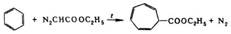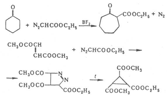 (R = H, Alk, Ac). Присоединение диазоуксусного эфира по кратным связям и внедрение :СНСООС2Н5 по простым связям используется для расширения цикла ароматич. соединений и циклич. кетонов и получения производных циклопропана, напр.: