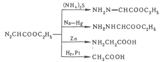 При взаимод. с конц. NH3 образует глицин, аспарагиновую к-ту и их амиды. При нагр. с порошком Си дает диэтилфумарат, а при обработке щелочью - производное сим-тетразина. Направление восстановления диазоуксусного эфира зависит от используемого реагента: