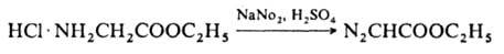 Получают диазоуксусный эфир р-цией гидрохлорида этилового эфира глицина с азотистой к-той: